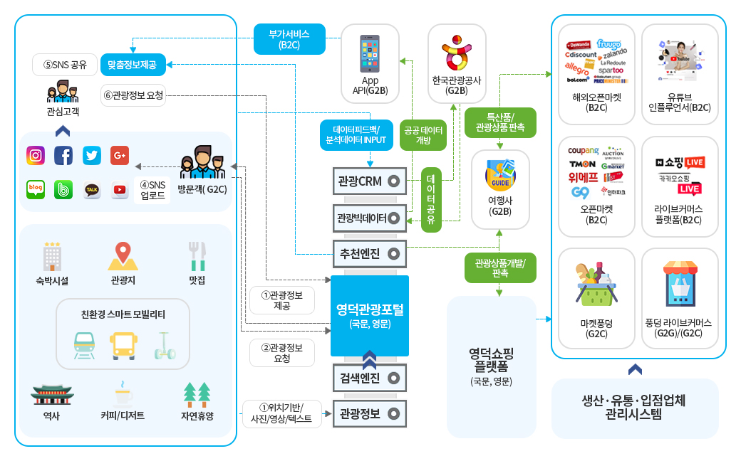 - 영덕 관광 포털의 경쟁력 강화 및 모바일 환경 개선이 필요하고 고객관계관리, 빅데이터, 추천엔진을 통한 맞춤형 관광 정보 서비스 제공 기반 구축
